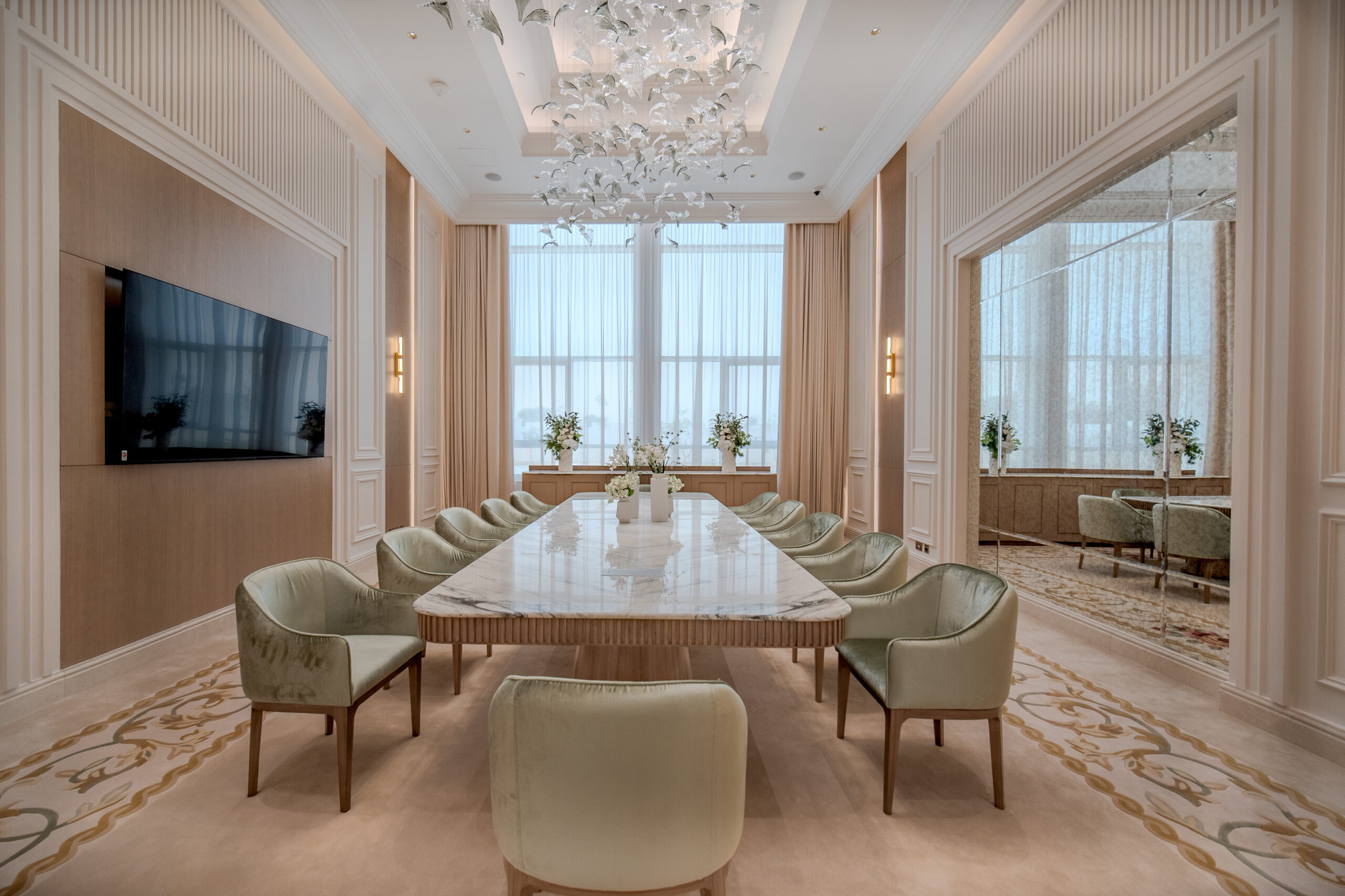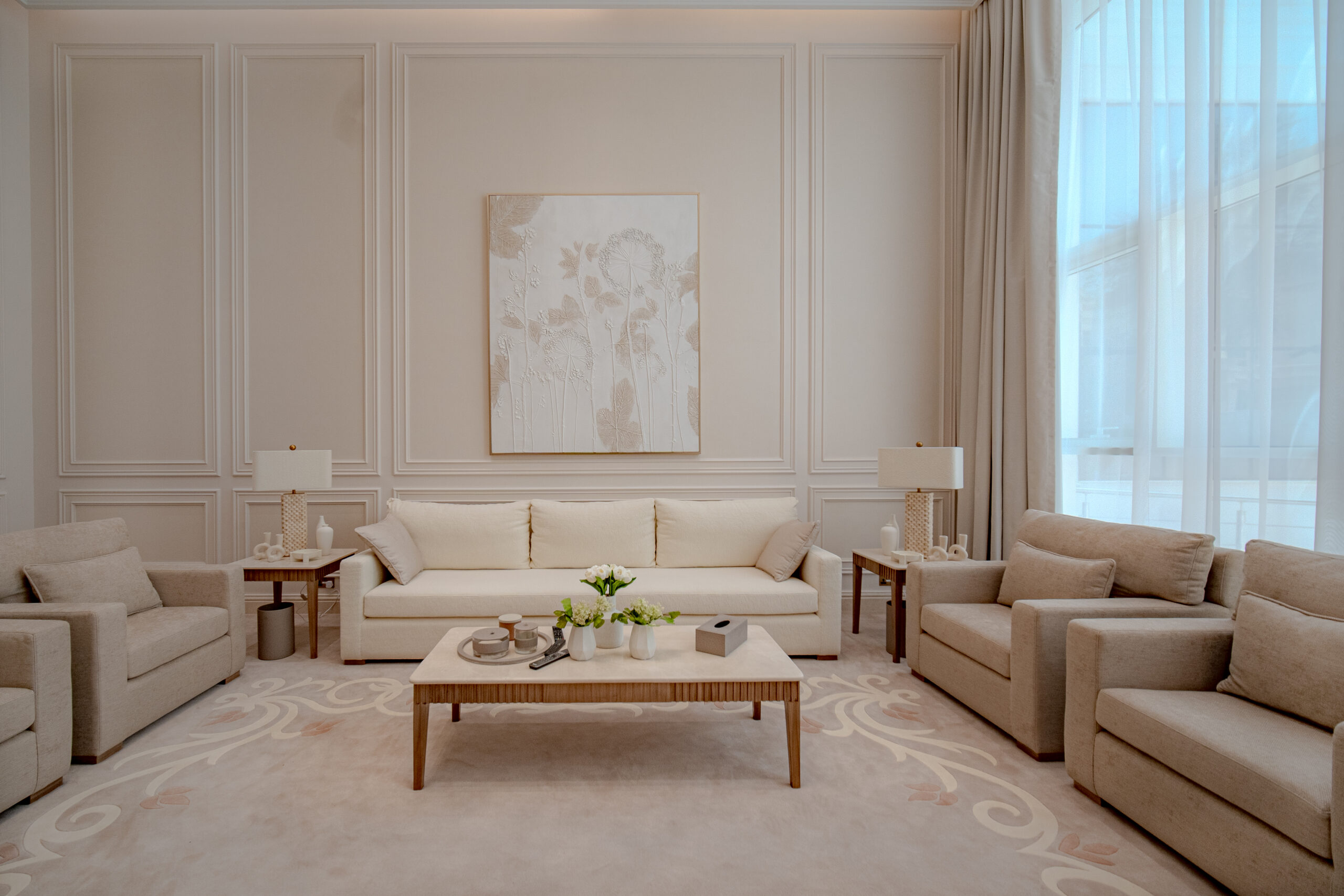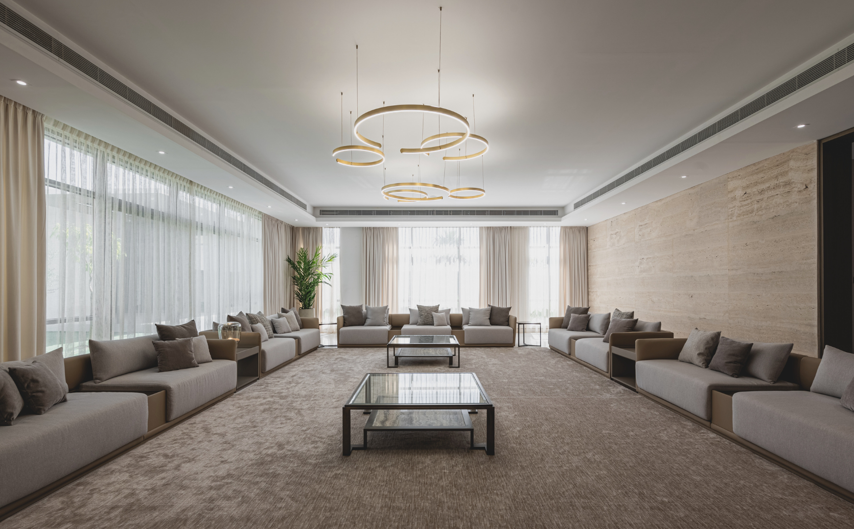 A Majlis that blends comfort and sophistication, featuring clean lines, neutral tones, and a contemporary ambiance designed for refined social gatherings.